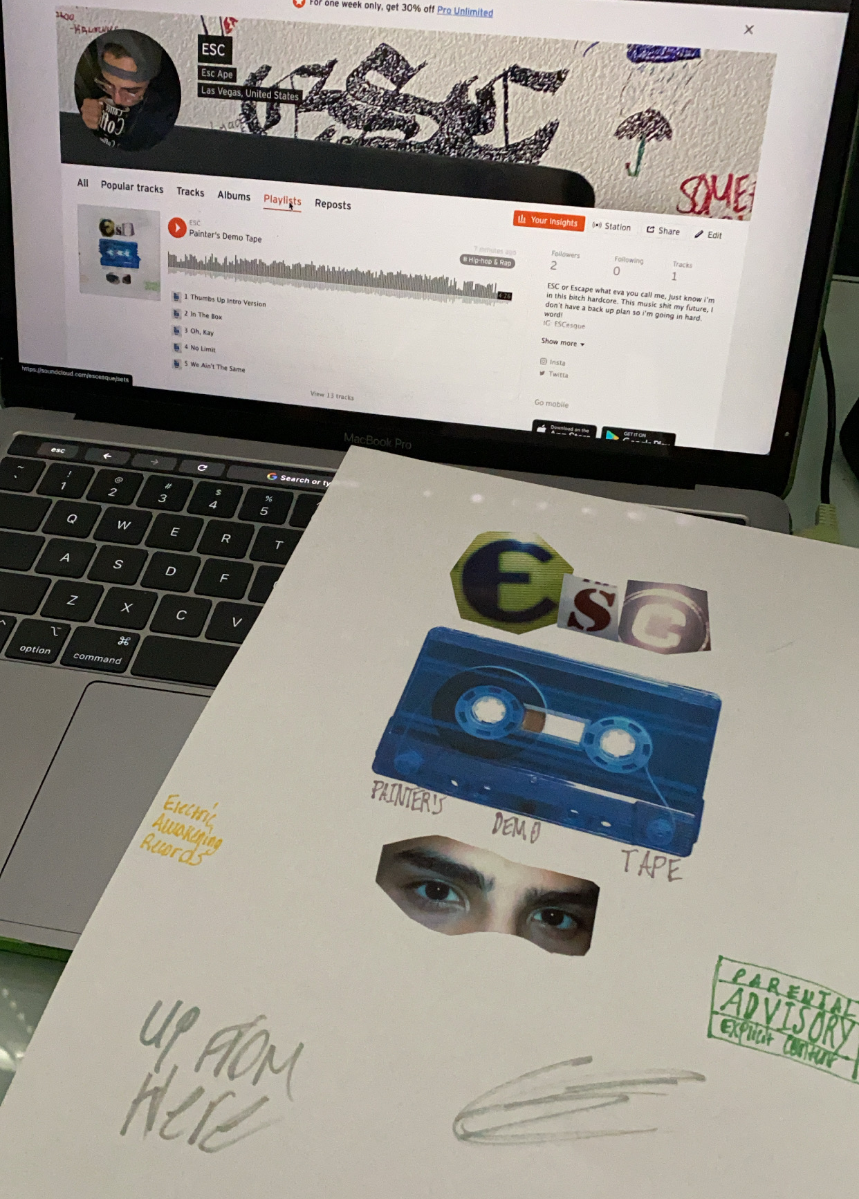 Up until the Summer of 2021, ESC worked diligently to finish all the songs nestled in the mind. Once completed, the challenge of the album art presented itself. Pictures of the letters E, S, and C were taken, cut, and then attached to a paper alongside a picture of ESC’s eyes. The title is written in Sharpie, with a blue demo tape in the center. Scanner warping completes the distorted look. The art perfectly encapsulates the artist.
